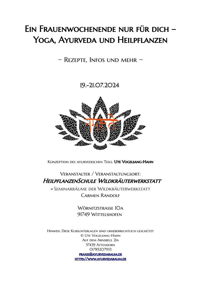 In diesem einmaligen 2,5-tägigen Workshop verbinden drei Lehrerinnen das Beste aus drei Welten. Du erfährst und spürst, wie das Zusammenspiel von ayurvedischen (Ernährungs-)Prinzipien, sanfter Bewegung und Beruhigung des Geistes durch Yoga, sowie die Heilkräfte der Natur eine harmonisierende Wirkung auf deinen Körper und deine Seele haben wird.