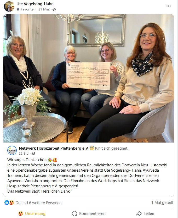 Im letzten Jahr kam Ute ihrer tiefsten Überzeugung nach, dass Dorfgemeinschaften und dem entsprechend Dorfvereine so wertvoll und unterstützenswert sind, dass sie den Erlös des im obigen Facebook-Post genannten Workshops in voller Höhe dem
